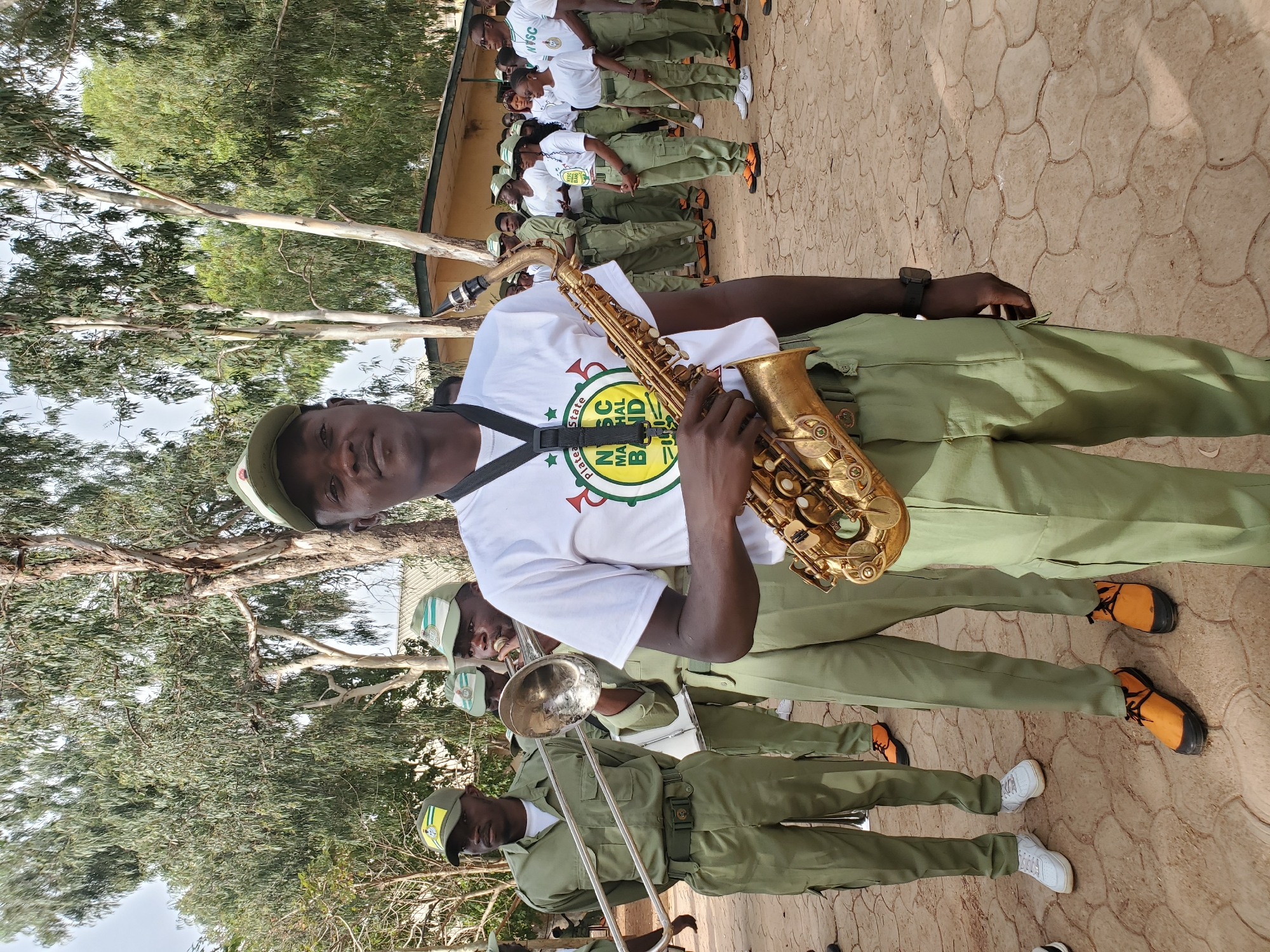 An outdoor scene in Jos, Nigeria, depicts a group of individuals, primarily young adults, associated with the National Youth Service Corps (NYSC) band. A male individual stands in the foreground, centered, wearing a white t-shirt with a "Plateau State NYSC National Band" logo, olive green cargo trousers, an olive green cap with an emblem, and dark shoes with orange laces. He holds a brass saxophone with his left hand, suspended by a black neck strap, and wears a dark smartwatch on his left wrist. His gaze is directed towards the viewer. To his left, another male in a full olive green NYSC uniform and cap plays a silver trombone, while a third individual in a similar uniform stands further left, hands behind his back. A line of approximately 15-20 additional individuals, mostly in olive green trousers and white NYSC branded t-shirts, extends into the background on the right, some holding drumsticks and standing in formation. The ground is a dry, reddish-brown surface with a distinct interlocking geometric pattern. The background features several tall trees with light-colored trunks and dense green foliage, and a light-colored building with a dark roofline is partially visible behind the trees on the far right.