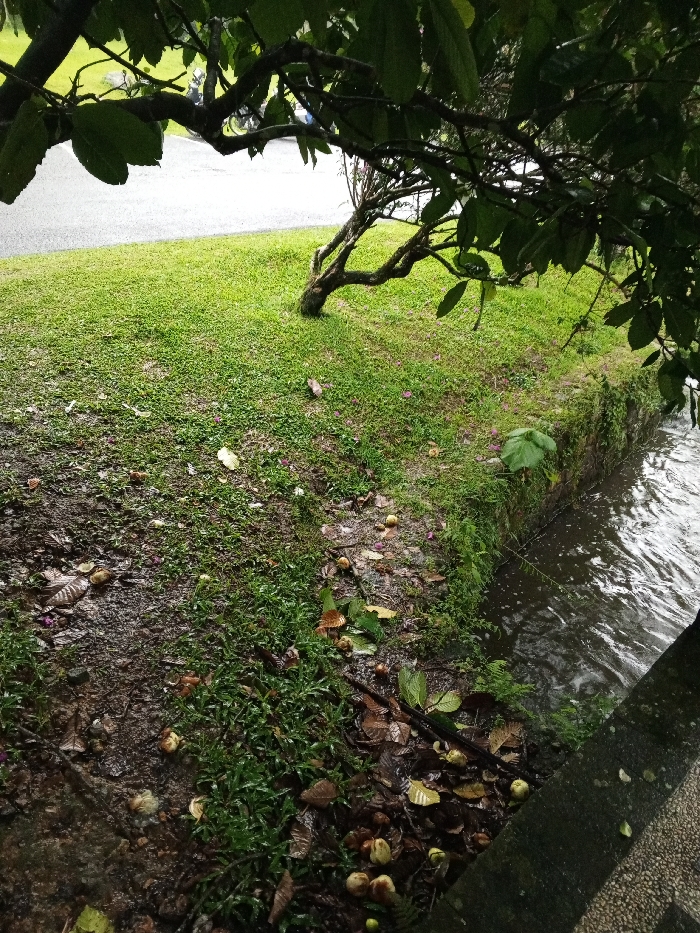 A verdant scene features a tree with thick, dark leaves. Green grass covers a gentle slope, leading to a stone-edged stream or waterway. Fallen fruit and foliage litter the ground near the water, adding texture and a sense of natural decay. The water's surface reflects the surroundings, with a concrete wall visible along the stream's edge.