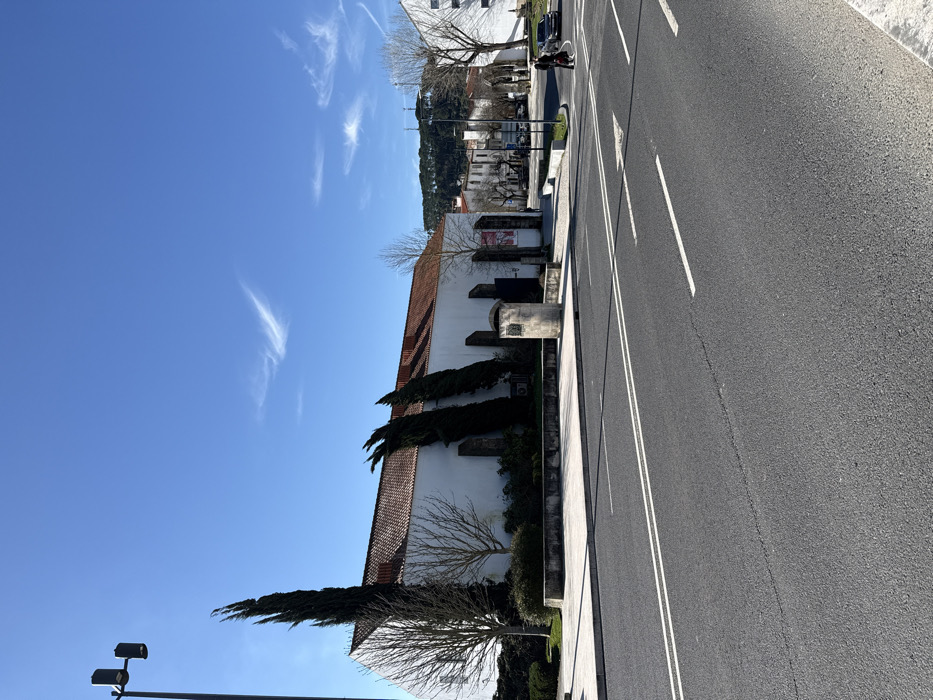 The image displays an urban street scene in Tomar, Portugal, specifically facing the former Convento de São Francisco (now cultural facilities like Cine-Teatro Paraíso) on Avenida Cândido Madureira. The foreground features a wide asphalt road with two visible lanes separated by double solid white lines. A single solid white line delineates the road edge on the right. Painted white arrows and dashed lines are visible further down the road, indicating traffic guidance. The asphalt exhibits minor surface cracks. The midground is dominated by a long, single-story building with white walls and a reddish-brown terracotta tiled roof. Several tall, dark green cypress trees are planted directly against the building's facade, alternating with dark, narrow architectural elements. Bare deciduous trees with thin branches are also present on the property. A raised, light-colored concrete planter or low wall runs along the building's perimeter. In front of this, a light-colored stone monument, possibly a plinth or pillar with an attached plaque, stands on a paved pedestrian area. To the far left, a black streetlamp with two cylindrical luminaires extends upwards. In the mid-to-background, to the right, a solitary individual dressed in dark clothing is observed walking across a pedestrian crossing. A dark-colored sedan is partially visible behind the person, either parked or in motion. Further down the street, additional white and light-colored buildings with terracotta roofs are visible, characteristic of a Portuguese townscape. A large hill, densely covered with green vegetation, rises in the distant background. The sky is clear and blue with minimal, wispy white clouds. The scene is illuminated by bright daylight, casting visible shadows.
