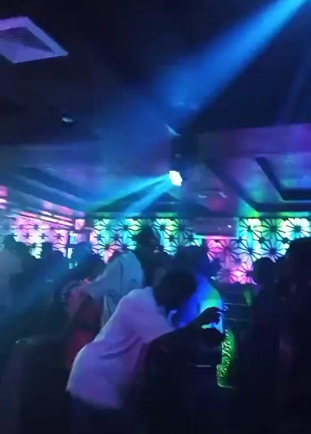 A dance floor is packed with people in a nightclub setting