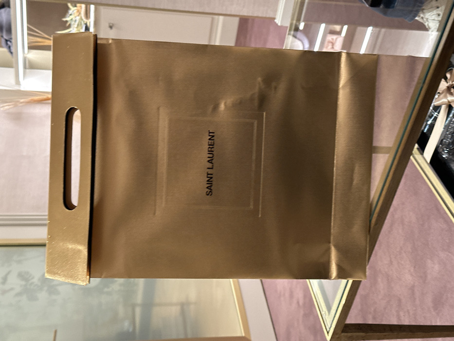 - "A gold-colored Saint Laurent shopping bag stands upright on a two-tiered glass and brass-toned metal display table" by FM-7S7sy2, licensed under CC BY 4.0