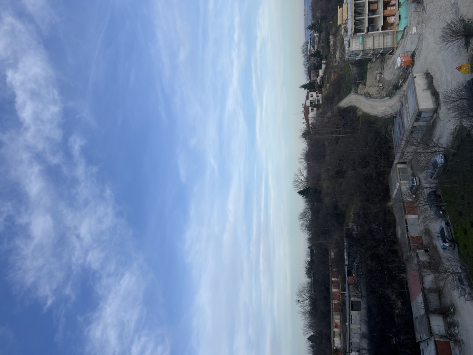 The image depicts an elevated view of a mixed-use area in Shumen, Bulgaria, characterized by urban development transitioning into natural terrain under a partly cloudy blue sky. The upper half of the frame shows a wide expanse of clear blue sky, featuring scattered, wispy white cirrus clouds and some broader, thinner stratocumulus formations, particularly near the horizon which fades into a lighter blue-grey haze. The lower half of the image presents a detailed landscape. In the immediate foreground, a series of older, single-story garages or storage units with varying roof types (some metal, some concrete) are visible, arranged in rows. Several passenger vehicles, predominantly dark-colored or silver sedans and hatchbacks, are parked on a dirt or gravel surface in front of these structures. No individuals are visible in or around the vehicles or garages. Midground features a prominent, densely vegetated hillside covered primarily with leafless deciduous trees and shrubs, indicating a late autumn or winter season. A light-colored, unpaved dirt road snakes uphill through this vegetation, originating from the lower right and ascending towards the upper midground. To the right, an active construction site is visible. A multi-story concrete building frame, currently under construction, displays exposed rebar and some unfinished brickwork on its lower levels. Pallets of construction materials, including bricks, are stacked near its base. Adjacent to the building frame, an orange portable toilet is situated on the cleared dirt ground. A yellow triangular warning sign with a black border is partially visible in the bottom right corner of the frame. In the background, on a more distant hilltop, several residential structures, predominantly single-family homes with pitched roofs, are discernible amidst sparse vegetation. The overall scene suggests an area undergoing development and expansion, blending established residential zones with natural hillsides and new construction. No discernible human activity or interaction is captured in the frame.