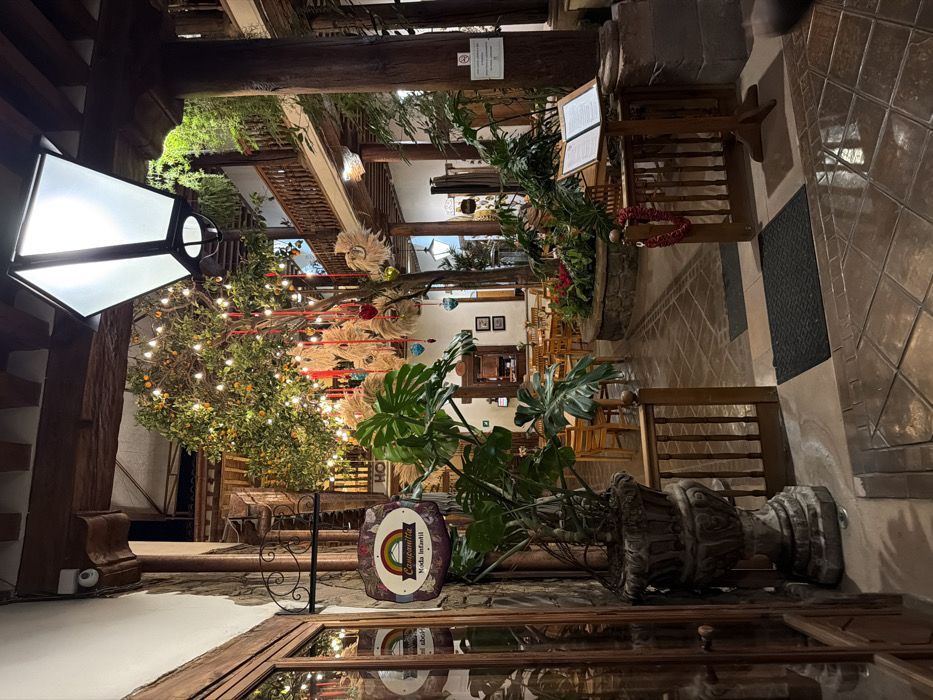 An ornately decorated interior space is visible. A white-lit, boxy lamppost is mounted on a wood beam. A leafy, lighted tree stands near a small sign bearing the words "compania infantil". Various decorations are suspended from the ceiling. Tables and chairs populate the background, while stone-tiled floors lead further into the space. Lush plants in large, decorative pots add to the ambiance.