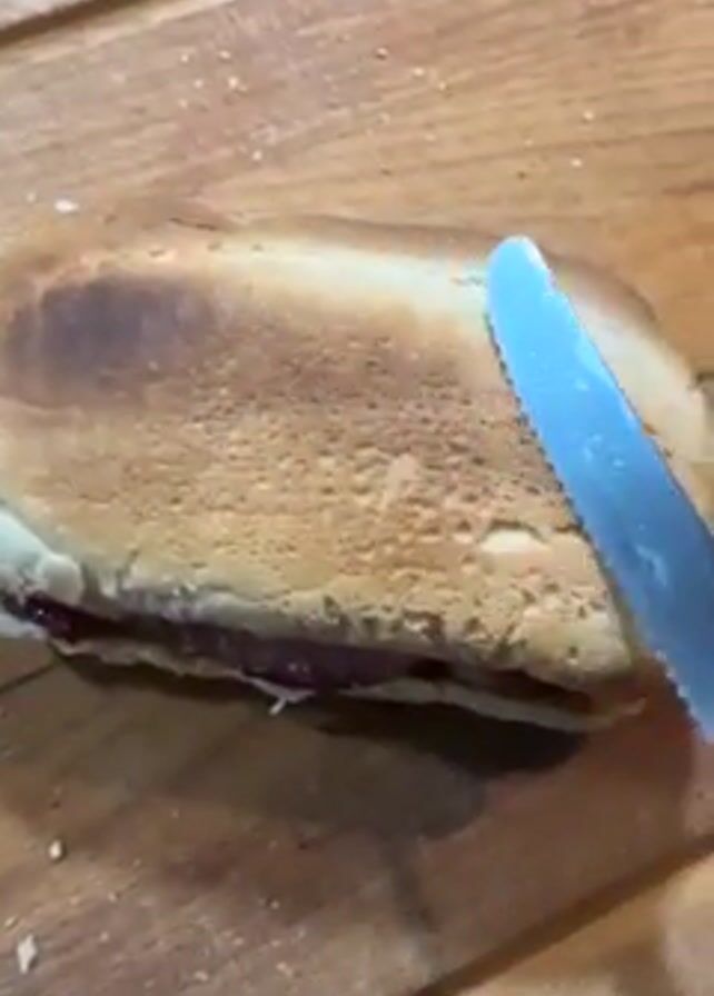 close-up view of a toasted sandwich being sliced on a wooden cutting board. The sandwich has a brown crust and appears to contain meat and white cheese inside. A knife with a silver blade and pink handle is used to cut the sandwich. Small crumbs are visible on the cutting board.