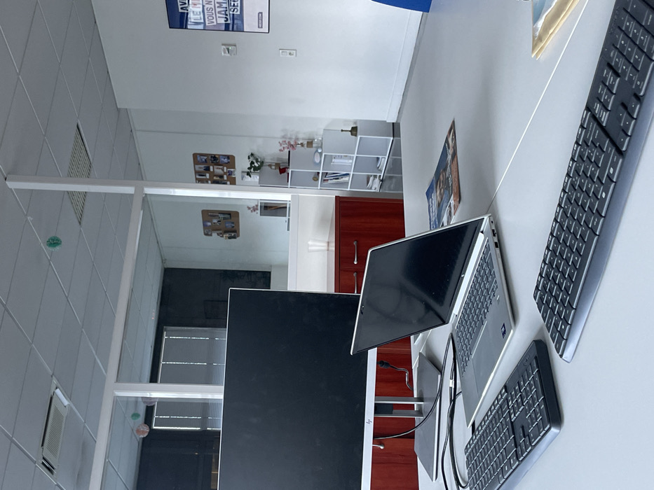 The image displays an unoccupied office interior, likely a workstation or meeting area, within a French-speaking environment, as indicated by visible text