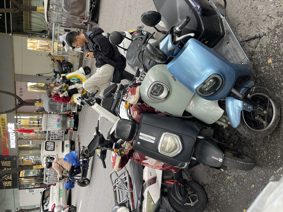 The image depicts an urban street scene in Zhengzhou, China. In the immediate foreground, a cluster of electric scooters and motorcycles is parked. The closest is a light blue scooter positioned at an angle, with a mint green scooter to its left, and a dark grey/black scooter with a red patterned protective cover further left. To the right, a man in his 30s-40s with short dark hair, wearing a dark jacket and light-colored pants, is seated on a white electric scooter. His left leg is casually extended onto the handlebars of the scooter in front of him. He is holding and looking at a smartphone with both hands. In the midground, the street is active with various vehicles. A person in a light brown jacket is riding a dark blue electric scooter, moving left, with a large blue plastic bag secured to the rear. To the right of the moving scooter, two women are seated on a static light yellow electric scooter; one wears a red jacket, the other a light top. Several three-wheeled enclosed electric vehicles (tuk-tuks), one white and one beige, are parked or driving further down the street. A white car is visible in the background, partially obscured by other vehicles. The background features multi-story commercial buildings with large glass storefronts. Store signs in Chinese characters are visible, including "MINGDU名度" and "瑞金居". The street surface is asphalt, appearing somewhat damp. The lighting is diffuse, suggesting an overcast daytime.