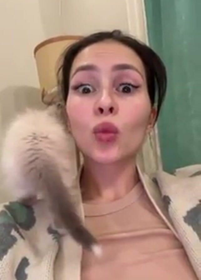 A woman is in a room with a small kitten on her shoulder. She is wearing a light beige top and a white cardigan with a green and gray pattern. The kitten appears to be light-colored with a dark tail. The woman looks at the camera and makes a kissing face. Behind her, there is a lamp with a beige shade and a light green curtain. There is audio of two people speaking. One person says "I said nonprofit, not please pop it."