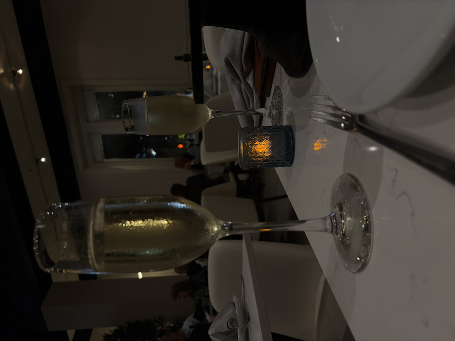 Two champagne glasses, one nearly full and the other partially filled, sit on a marble-like tabletop alongside a small, ornate candle holder with a lit candle. Silverware is placed neatly near the glasses. In the background, diners are visible in a dimly lit restaurant setting with large windows. The scene exudes a sophisticated and intimate atmosphere.