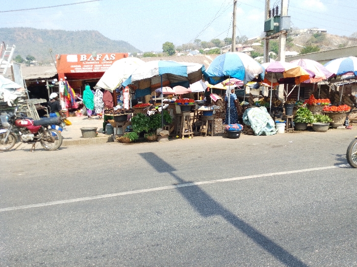 The scene depicts a vibrant street market situated alongside an asphalt road in Lokoja, Nigeria