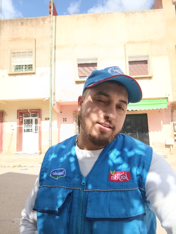 The image captures a male individual taking a selfie on a street in Meknes, Morocco, under bright daylight with a blue sky and scattered white clouds overhead
