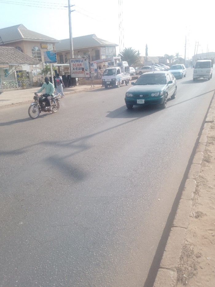 This image captures a sunlit street scene in Sabon Tasha, Nigeria