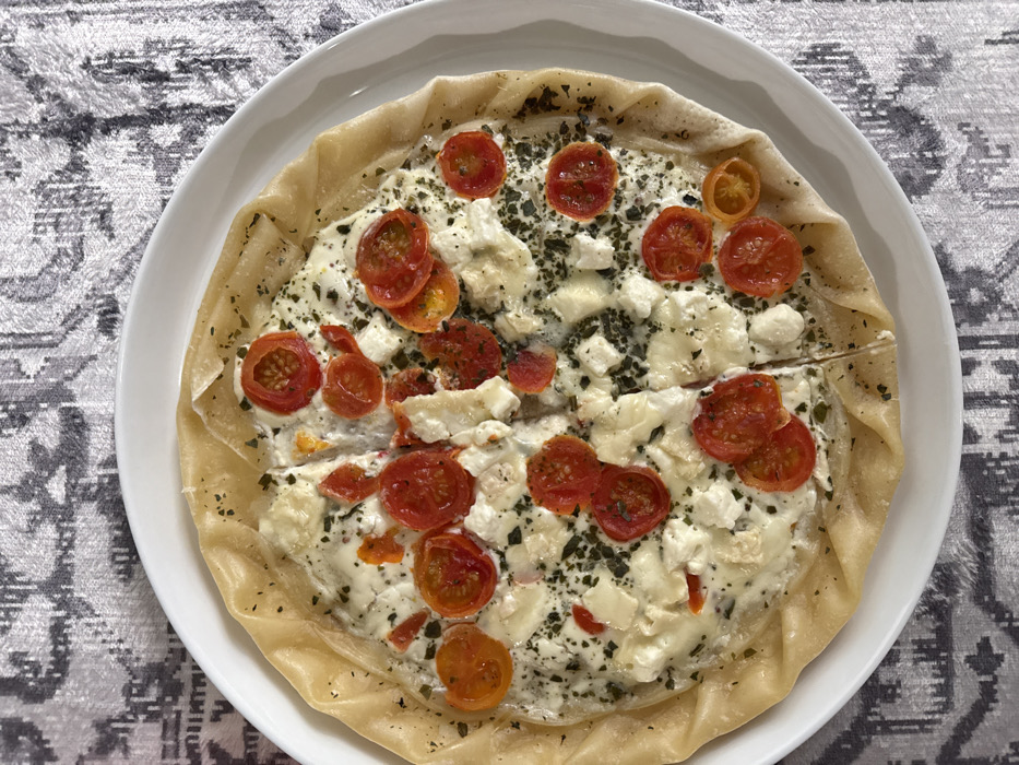 - "A tomato and cheese galette sits on a white plate resting on a patterned grey surface" by FM-rSR2K3, licensed under CC BY 4.0