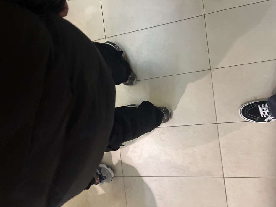 The image displays a low-angle view of the lower extremities of three individuals standing on a tiled indoor floor. In the foreground, a person's feet are visible, wearing dark blue denim jeans and black Vans Old Skool sneakers with white laces. Directly in front, another individual is positioned, clad in black pants and grey and silver athletic shoes, one shoe exhibiting a visible Nike swoosh. To the left and slightly behind, a third person's feet are seen, wearing grey athletic shoes with blue accents and velcro straps. The floor is constructed of large, light-colored square ceramic tiles with dark grout lines. The scene is illuminated by artificial overhead lighting, producing diffuse shadows on the floor. The environment is characteristic of an indoor public space such as a shopping mall or large retail area. No specific identifying features are present to determine the precise location within Sofia, Bulgaria.