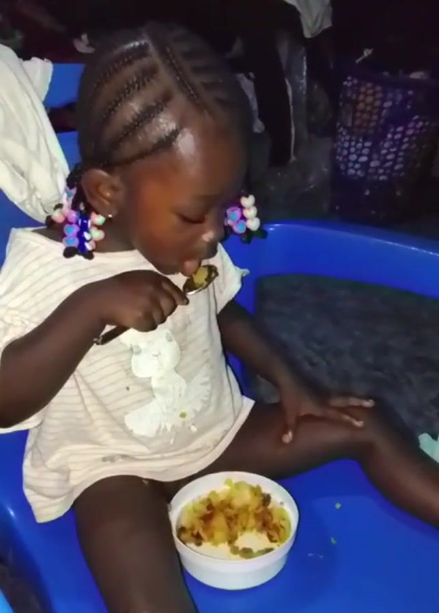 Here's a concise description of the video: A young Black girl with braided hair sits on a blue plastic chair, eating food from a white bowl