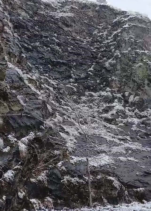 snow-covered rocky hill or cliff with a few trees in front of it. It appears to be snowing lightly. The trees are bare, but have a coating of snow. At the bottom of the frame, there is some wet ground with snow. A green tarp-covered object is visible on the right side of the frame, next to a tree. The overall scene is gray and white due to the snow and overcast sky. There is also a person speaking in the background.