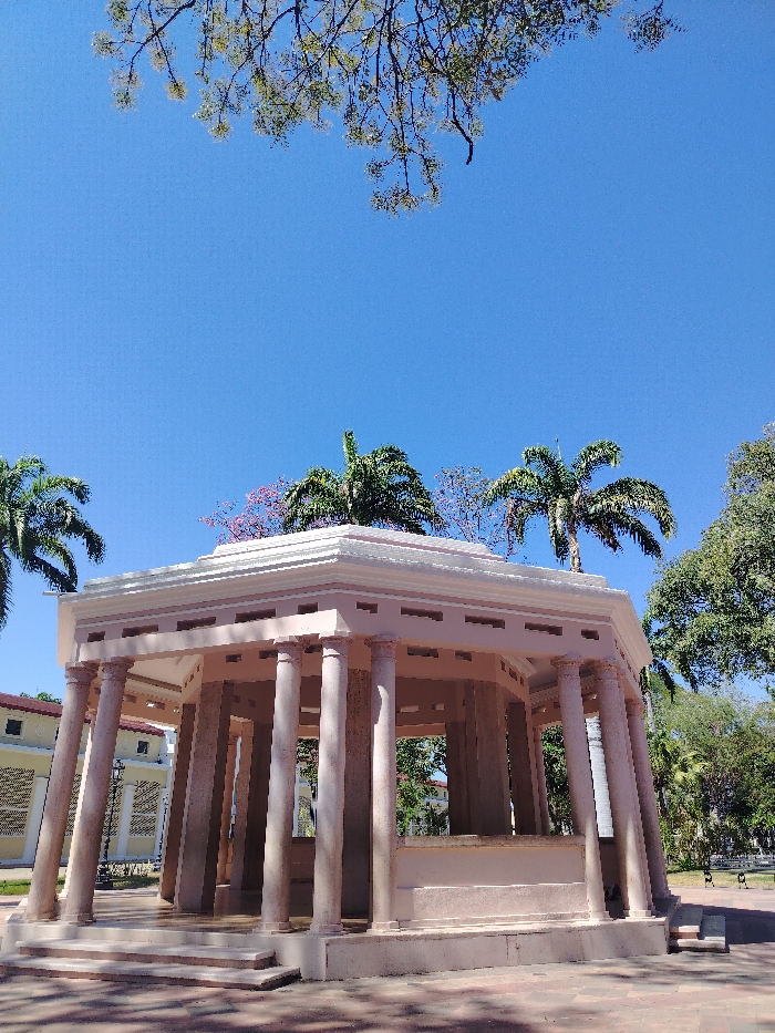 An outdoor, upward-angled shot captures a light pink and white octagonal gazebo with classical columns, centrally located in the Plaza Bolívar de Maracay, Venezuela