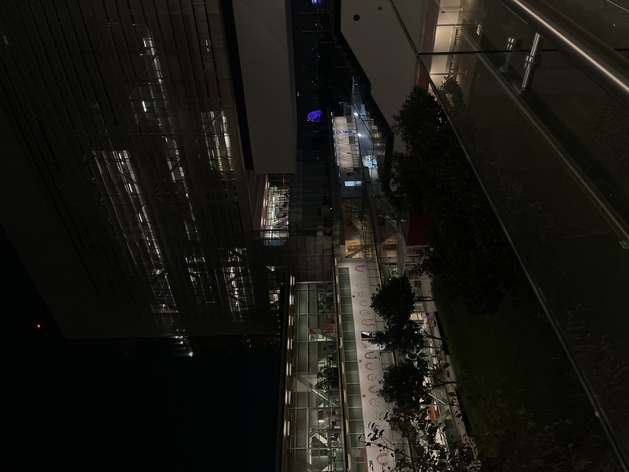 The image displays an elevated, wide-angle nighttime view of a modern urban complex, specifically identified as likely the Mítikah complex in Coyoacán, Mexico City, Mexico, due to a prominent blue-lit Ferris wheel visible in the distant background. In the foreground, a dark, multi-level outdoor area features sparse greenery, including trees and patches of grass. A transparent glass and metal railing runs across the lower right, indicating the viewer's elevated position. The middle ground reveals a series of interconnected contemporary buildings with glass and concrete facades. A long, white wall spanning a lower level features a large mural composed of multiple distinct, stylized human portrait illustrations arranged horizontally. Above this mural, a multi-story building section presents extensive glass fenestration, revealing interior spaces with visible lighting, red chairs, and tables arranged, suggesting a dining or lounge area. Further back and to the right, a tall, dark building with a facade characterized by horizontal louvers exhibits scattered internal lights through its windows. Artificial illumination from building interiors and scattered outdoor light fixtures provides the primary light source for the scene. No individuals are visible within the frame. The overall environment is quiet and appears largely deserted. The sky is dark, indicating night conditions.