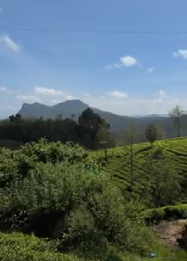 scenic landscape on a bright, sunny day. A distant mountain range is visible under a blue sky dotted with a few white clouds. In the foreground, a hillside is covered with lush green tea plantations. A scattering of taller trees are interspersed among the tea plants. Some overgrown vegetation obscures a portion of the lower left corner. An overhead power line is visible in the upper part of the frame. The camera seems to be panning slowly to the right.