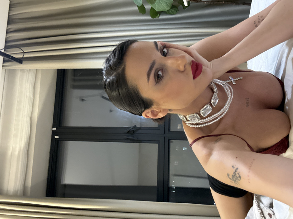 The image displays a female subject positioned prone on a white bedspread in an indoor setting, identified as Khimki, Russia. The subject is propped on her right forearm, with her left hand resting against her jawline. She has dark hair styled back from her face, dark eyes, winged eyeliner, and red lipstick. She is wearing a dark red lace bra and dark shorts. Multiple necklaces adorn her neck, including a wide clear gemstone choker, two strands of pearls, and a jeweled cross pendant. Visible tattoos include text on her right upper arm, partially legible as "PLEASURE," and a symbol above it. On her sternum, the word "NAIVE" is tattooed. A partial text tattoo is also visible on her left forearm. In the background, a large, dark-framed multi-pane window reveals a nighttime urban landscape with illuminated buildings and distant lights, indicating an elevated floor. Light brown curtains are partially drawn on either side of the window. A thin, dark linear light fixture is visible on the ceiling, and the top portion of a green leafy plant is seen on the right side of the frame.
