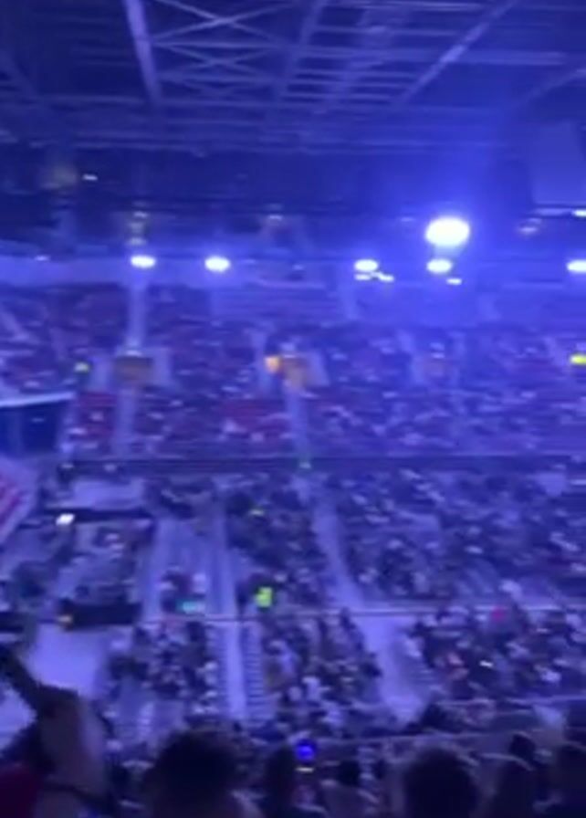 The video captures a view from the stands of a large, crowded arena bathed in blue light