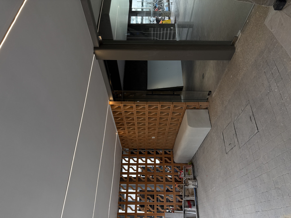 An upward-angled shot showcases an architectural space. Gray tiled flooring leads towards a modern entrance with a dark frame and glass panels, revealing a glimpse of bicycles. A textured, decorative wall of hollow clay blocks extends along the side, with a long, neutral-colored bench adjacent to it. The wall transitions into a plain gray surface featuring vertical illuminated strips. The overall design conveys a contemporary and minimalist aesthetic.