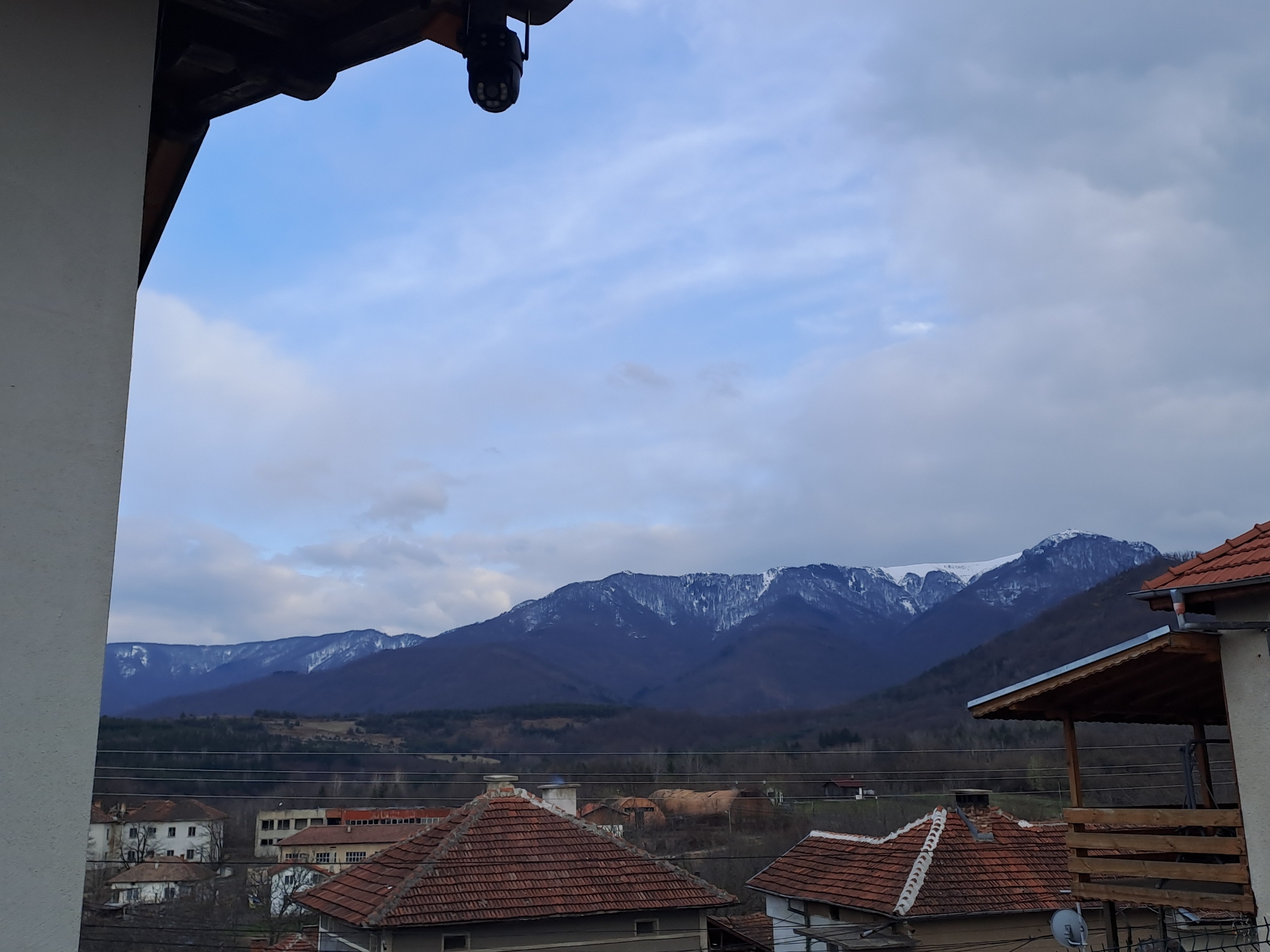 The image presents a panoramic elevated view of Varshets, Bulgaria. In the upper left foreground, a section of a textured, light-colored wall is visible, extending vertically. Directly above, a dark architectural overhang projects into the frame, with a black dome-shaped security camera mounted underneath, facing outwards. The midground displays a residential and light industrial urban landscape. Numerous buildings with terracotta-colored tiled roofs are visible across the frame. On the left, older structures with light-colored facades are present, along with a larger, multi-story building with a flat roof. To the right, another building features a prominent wooden balcony or porch with horizontal slatted railings. Overhead utility lines span horizontally across the midground, above the structures. A small satellite dish is present on one of the roofs on the right. The background is dominated by a majestic mountain range. The lower slopes are densely covered with dark, leafless or evergreen forestation, transitioning to rugged, higher peaks. These peaks show distinct patches of snow or frost. The sky above is partially overcast, displaying a mix of blue patches and greyish-white clouds. No individuals or specific actions are discernible.
