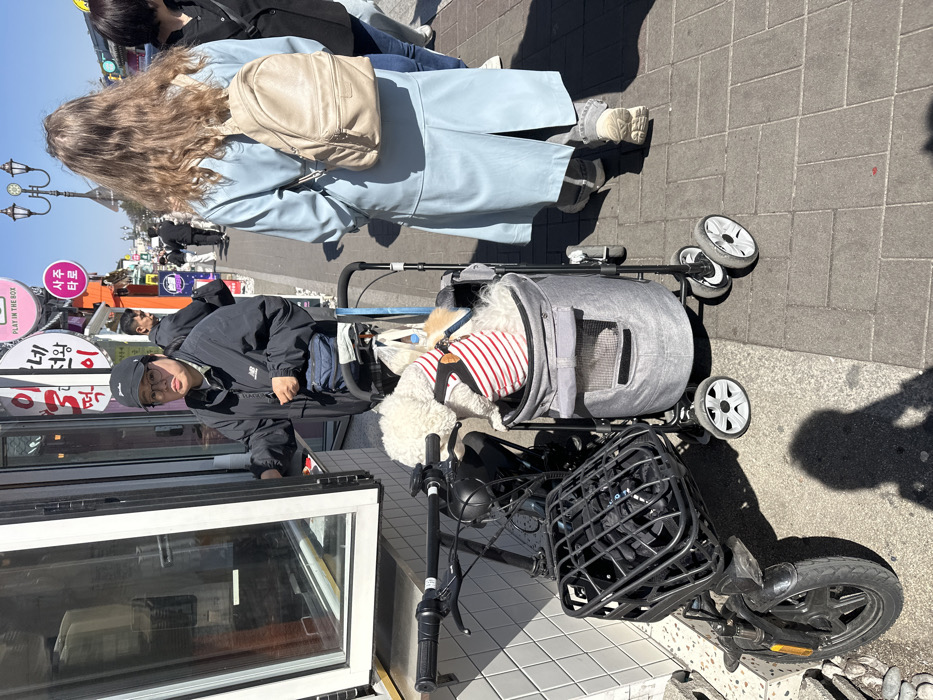 The image depicts a daytime street scene in Gyeongju-si, South Korea. On the left, an electric scooter, black with a front-mounted black wire basket, is parked on a concrete sidewalk adjacent to a building with a white-tiled lower facade. An open white-framed window is visible on the building. Standing near this window is a person wearing a black baseball cap, clear-rimmed glasses, and a black New Balance jacket, with a blue shoulder bag across their body. Their right hand is extended towards the window opening. Their facial expression is neutral. Adjacent to this person and positioned centrally, a gray four-wheeled pet stroller contains two small dogs. One dog, with white curly fur, is prominent and wears a red and white striped garment. A second, smaller brown dog is partially visible within the stroller. To the right, a second person, seen from behind, walks away from the camera. This individual has long, light brown hair and is wearing a light blue trench coat and a beige backpack. Light-colored trousers and athletic shoes are visible below the coat. The background reveals a commercial street lined with various storefronts displaying Korean signage, including circular signs with "PLAY IN THE BOX" and "사주 타로." A black, traditional-style lamppost stands in the mid-ground. The ground is composed of gray paving stones and concrete. The scene is brightly lit by sunlight, indicated by distinct shadows.