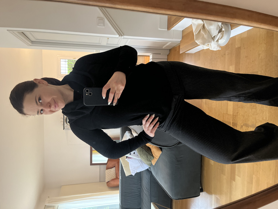 A female individual is depicted in a mirror selfie, standing indoors in a residence located in Rueil-Malmaison, France. She faces the camera with a slight smile. Her dark hair is pulled back, and she is wearing a black long-sleeved cowl neck sweater and black trousers with subtle vertical pinstripes. Her left hand (viewer's right) holds a dark-colored smartphone, while her right hand (viewer's left) rests on her hip. Her fingernails are painted with a light, reflective polish. The background, reflected in the mirror, shows a living space with light-colored wooden flooring and white walls. To the left, a dark grey sectional sofa with several throw pillows (white, green, and orange/brown) is visible. Behind the sofa, an orange armchair is partially seen, along with a rectangular mirror with a dark frame on the wall. A window or glass door with light-colored sheer curtains reveals outdoor greenery. To the right, a white door with a wooden frame, a light switch, and wooden stairs with white risers are visible. A light-colored cloth item rests on one of the stair steps. A black metal shelving unit is partially visible behind the woman's head.