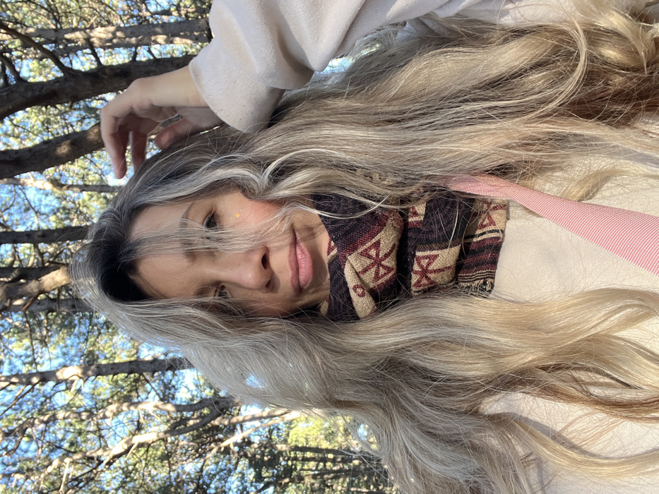 A female individual is depicted in a close-up, selfie-style photograph taken in a wooded area of Kavač, Montenegro. She has long, wavy, blonde-to-light-brown hair with visible gray strands, flowing over her shoulders and chest. Her right hand is positioned with fingers touching the hair above her right ear. She wears a light-colored, possibly cream or beige, outer garment. A multi-colored scarf, featuring a pattern of dark brown/maroon and beige geometric shapes, is wrapped around her neck. A pink strap, possibly from a bag, crosses diagonally across her upper chest. Her face is turned towards the camera with a subtle expression, and small glitter specks are visible on her left cheekbone. The background consists of numerous deciduous trees with bare branches, under a clear blue sky, indicating an outdoor, natural environment. Natural light illuminates the scene, creating shadows and highlights.