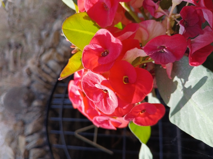 - "The scene depicts a close-up, outdoor view of a cluster of red-orange *Euphorbia milii* (Crown of Thorns) flowers with green leaves, positioned in the foreground and in sharp focus" by FM-YF5w12, licensed under CC BY 4.0