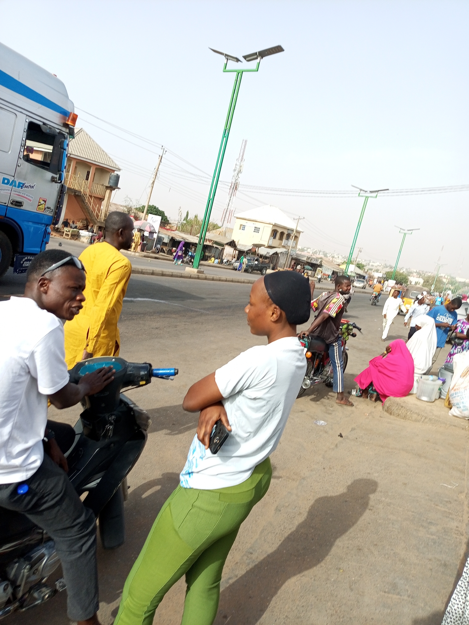 The image depicts a busy urban street scene in Gombe, Nigeria, under a bright, hazy sky. In the foreground, a dark-skinned male in a white t-shirt and dark trousers, with sunglasses perched on his head, is seated on a black scooter to the left. He faces rightward with his mouth slightly open, his right hand resting on the scooter's handlebar. To his right, a dark-skinned female wearing a black head covering, a light-colored top, and green trousers stands with her arms crossed, holding a black smartphone in her right hand; she faces left. Her elongated shadow is cast on the asphalt road surface to her left. In the mid-ground, a partial view of a blue and silver DAF truck is visible on the far left. A dark-skinned male in a yellow tunic walks away from the camera towards the right. Further right, another dark-skinned male in a patterned shirt and striped track pants stands next to a red motorcycle. On the right side of the road, a woman in a vibrant pink head covering is seated on a low curb next to several white plastic containers and bags, indicative of street vending, while another person in a white garment stands nearby. The background reveals multiple multi-story and single-story buildings lining the street, suggesting commercial and residential use. Tall green poles topped with solar panel-equipped LED streetlights are strategically placed along the thoroughfare. Overhead utility lines are visible across the sky. Additional pedestrians and vehicles, including motorcycles, are present on the road, contributing to the bustling atmosphere of the scene.