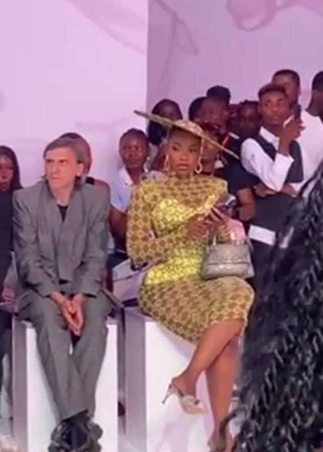 fashion show audience. The foreground is dominated by a person with dark braided hair. Further back, there is a row of people, some in focus and some blurred. A woman in a yellow and brown patterned dress and matching hat is seated, looking at her phone. To her left sits a man in a gray suit, and further to his left sits another man in all black. A pink background is visible behind the audience.