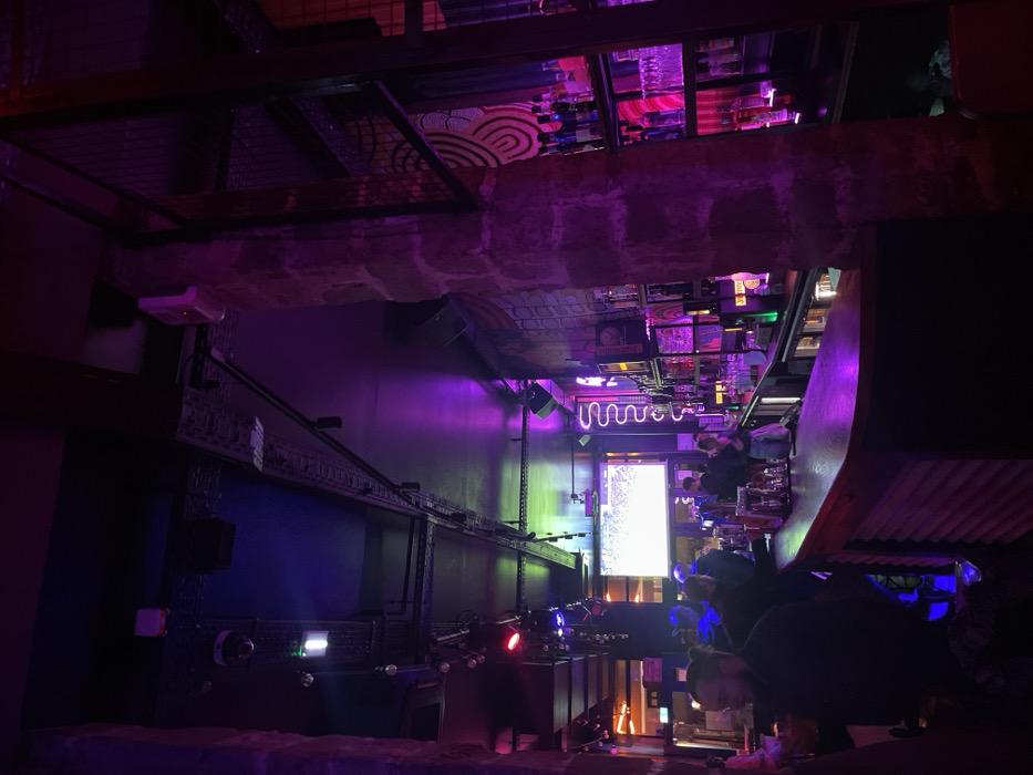 An interior space bathed in purple and blue light. Above, a bar's reflective ceiling showcases bottles and glasses. A neon squiggle adds ambiance near a bright exit. Below, shadowy figures stand at a counter. Wires and equipment are visible along the walls. The image appears to be taken from a low vantage point, possibly a table.
