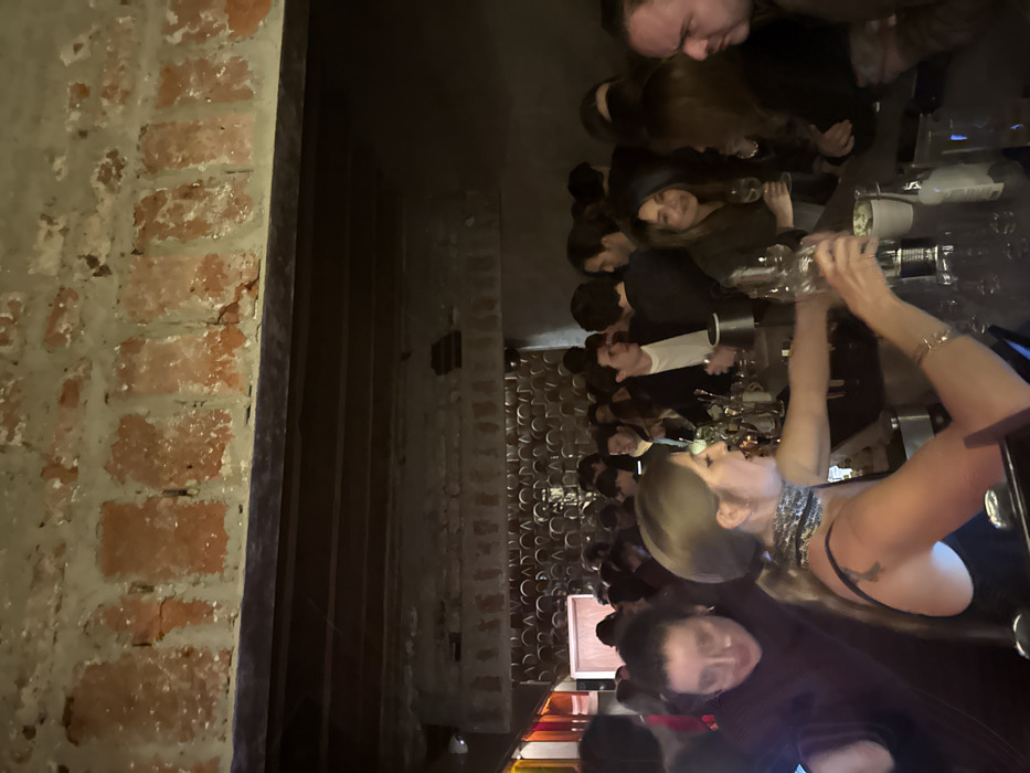 A crowded bar scene is captured. A bartender in a sparkly top mixes drinks. A line of patrons extends down the bar, some watching the bartender, others chatting. A brick wall borders the space on one side. Glasses and bottles are visible along the counter, indicative of a lively establishment. The atmosphere appears dimly lit and bustling.
