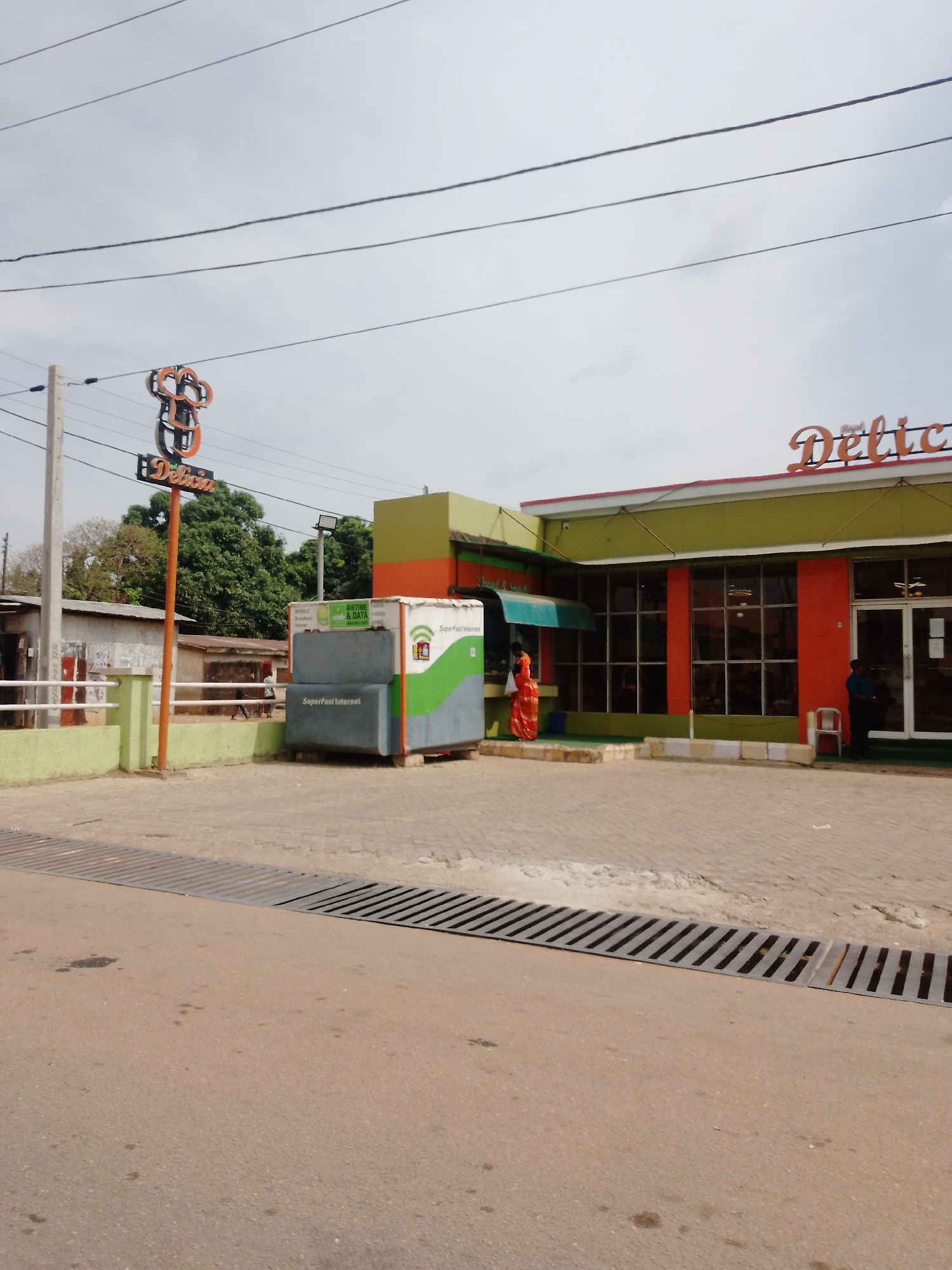 An exterior view in Yelwa, Nigeria, depicts the "Royal Delicia" commercial establishment and its immediate surroundings under an overcast sky. The primary building features a red facade with large, grid-patterned windows and a prominent orange "Royal Delicia" sign on its roofline. A green roof trim and upper wall section are also visible. To the left of the main entrance, a person in a reddish-orange garment stands near a gray and green mobile kiosk labeled "SuperFast Internet" and "AIRTIME & DATA." Another individual in a dark uniform stands near the glass double doors of the building's main entrance on the right. In the foreground, an asphalt road displays some minor stains and leads to a wide, linear metal drainage grate positioned across the road. Beyond the grate, the area in front of "Delicia" is paved with light-colored interlocking blocks. A tall sign pole with an orange "Delicia" sign and a stylized logo stands to the left of the building. Behind this sign and further left, simple, single-story structures with corrugated metal roofs are visible, backed by dense green trees. Overhead, multiple power lines stretch across the upper portion of the frame. A light-colored utility pole is present on the left side of the scene.