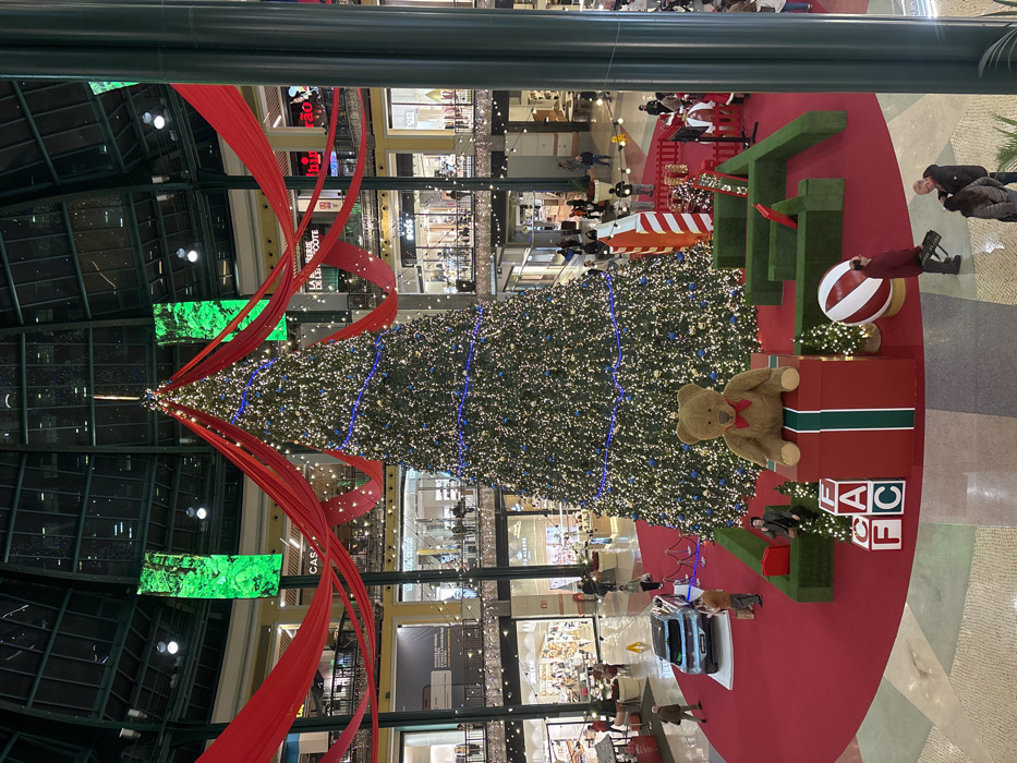 An indoor Christmas scene shows a very large, fully decorated tree in a shopping mall