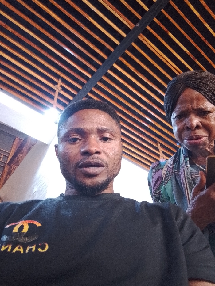 A selfie shows a man with a short beard, wearing a black t-shirt with a prominent logo. He is looking at the camera with his mouth slightly open. Behind him is an older woman with braided hair. She appears to be holding a smartphone. The background shows an interior ceiling with a linear pattern. The lighting is bright.
