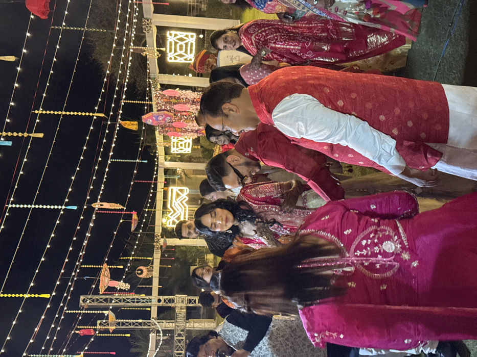 An outdoor nighttime gathering, potentially a wedding or celebration, is depicted. Strings of lights illuminate the scene, adorned with colorful decorative umbrellas. Guests are present, some dressed in traditional Indian attire, including shades of red and pink. One woman in an ornate outfit is the focal point, seemingly at the center of attention. People are gathered around her, suggesting a ritual or ceremony.
