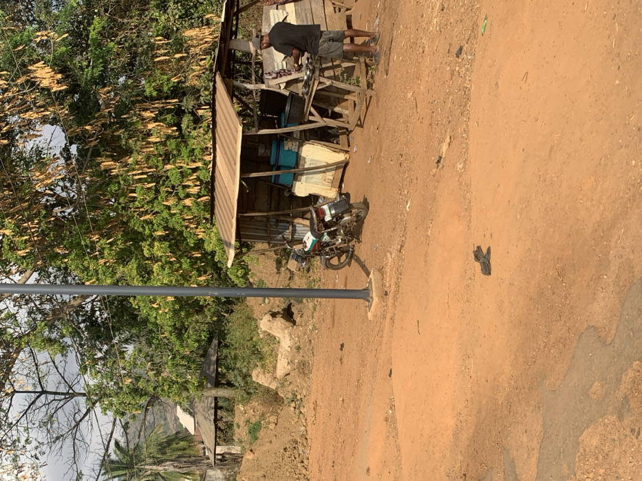 The scene depicts an outdoor setting in Okene, Nigeria, characterized by a predominantly reddish-brown dirt ground. In the central foreground, a pair of dark flip-flops lies on the dirt. A tall, grey metal street light pole with a square concrete base stands to the left of the image center. To its right, a white and green motorcycle is parked on the dirt, facing left. On the right side of the frame, a rustic, open-fronted stall is constructed from corrugated metal sheets and wooden supports, topped with a sloped corrugated metal roof. Inside the stall, multiple blue plastic containers are visible, along with a dark basin and several small, shiny metal bowls/plates on a wooden counter. A male individual, wearing a dark t-shirt, dark shorts, dark flip-flops, and a light-colored cap, stands behind the counter, facing left and attending to the items on it. The background features dense green vegetation, including a palm tree on the far left. A large tree prominently displays numerous elongated, light-brown seed pods. Behind the street light and to the left, mounds of reddish-brown earth and rocks are present, suggesting recent ground disturbance. Further back and partially obscured by vegetation, other structures with thatched or corrugated roofs are discernible. Thin, dark lines, possibly power lines, traverse the upper portion of the image. The scene is illuminated by bright natural daylight.