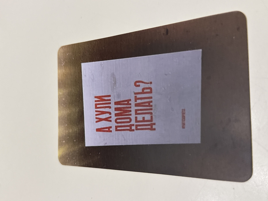 A rectangular card, predominantly brown with rounded corners, is lying on a white surface. Centered on the card is a light gray rectangle containing Russian text in red: "А ХУЛИ ДОМА ДЕЛАТЬ?". The bottom right of the gray rectangle has small, illegible text. The brown area around the gray rectangle has a textured, metallic look with highlights on the left.