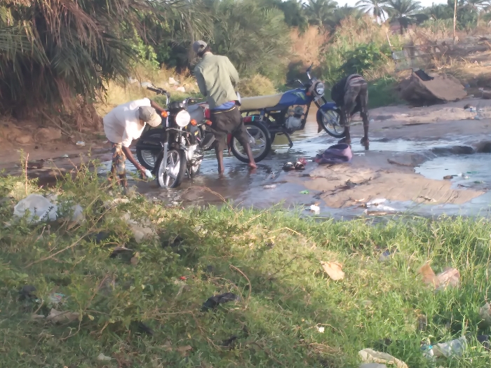 The image depicts an outdoor scene in an unspecified location, characterized by a shallow body of water traversing an unpaved area. Three adult males are present, engaged with two motorcycles. In the foreground, a verdant bank with scattered litter, including plastic bags and debris, occupies the lower third of the frame. Beyond this bank, a shallow stream or a large puddle with a muddy or rocky bottom extends across the midground. One male, wearing a light-colored shirt and a cap, is positioned on the left, bent over a dark-colored motorcycle. He is actively cleaning the front wheel and engine area of the vehicle, which is partially submerged in the water. A second male, wearing a green long-sleeved shirt and a cap, stands slightly behind the first motorcycle, partially obscured. His attention appears directed towards the first motorcycle or the water. A third male, clad in dark clothing, is visible on the right side of the water body. He is bent over a second motorcycle, which is blue and beige, also partially in the water. This individual appears to be attending to the rear wheel or frame of the second motorcycle. A purple bag and several small objects, possibly sandals or other personal effects, are situated on a small, raised dry patch of ground or rock between the two motorcycles. The background consists of dense, varied vegetation, including palm trees and other foliage, suggesting a rural or semi-urban environment. The overall scene indicates an informal motorcycle washing activity utilizing a natural water source in a somewhat unkempt outdoor setting. The specific city or region within "Unknown, Unknown" cannot be determined from the visual information provided, but the setting is consistent with an undeveloped or peripheral area.
