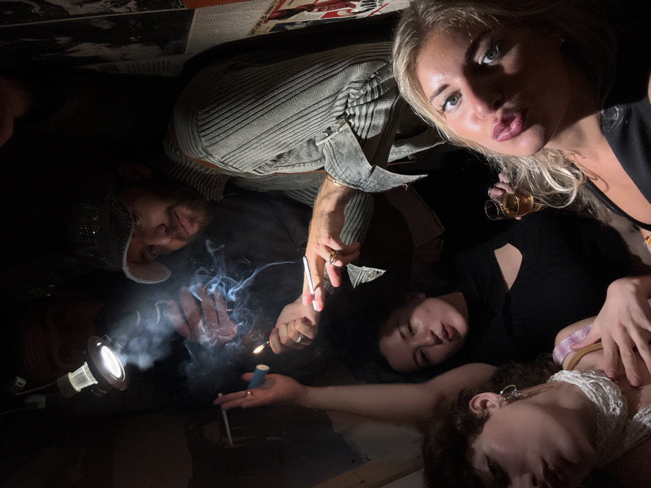 This image depicts a group of four individuals gathered in a dimly lit, confined interior space, indicative of a bar or club setting in Paris, France. A single, bright, unshaded LED bulb hanging from above illuminates the scene, creating harsh light and deep shadows. In the upper center, a man with a beard and a dark, studded baseball cap wears a grey ribbed turtleneck under a textured jacket. He is actively lighting a white cigarette with a silver lighter, generating visible smoke. He maintains direct eye contact with the camera. A shadowy figure is partially discernible behind him. To the man's left, a woman with dark hair and a black top featuring a chest cutout has her left arm raised, holding a blue-tipped object, possibly a vape pen or cigarette holder. Her expression is a slight pout, directed towards the camera. Adjacent to her left, another woman with dark, curly hair and a distinctive white woven necklace looks slightly away from the camera. In the lower right foreground, a blonde woman with prominent lips, pursed into a "kissing" pose, holds a champagne flute containing an amber liquid. She also looks directly into the camera. The immediate background on the right reveals a wall adorned with torn papers or posters, while the left side shows exposed wood framing. The overall scene captures a social interaction involving smoking, drinking, and posing for the camera.