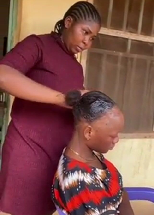 A woman with braided hair is seen standing and styling the hair of another woman who is sitting on a blue plastic chair