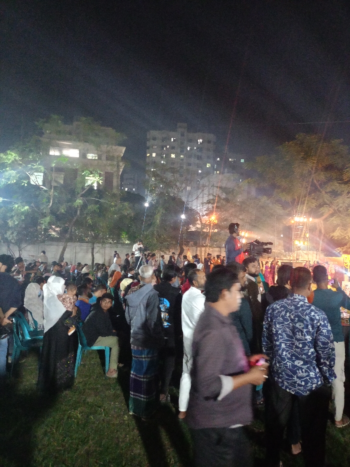A gathering of people, mostly adults, is gathered on a grassy area at night. Many stand, some sit on chairs. Buildings are visible in the background. A cameraman on an elevated platform appears to be filming an event. The scene is illuminated by artificial lights, casting shadows on the ground and people. The atmosphere seems festive and informal.