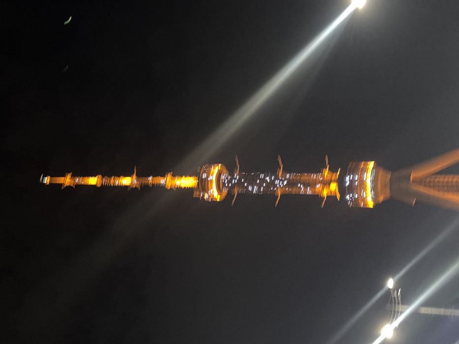A nighttime shot captures the Oriental Pearl Tower, illuminated in golden light against a dark sky. The tower's distinctive spheres and needle-like top are visible. Bright streaks from nearby streetlights cut across the lower right of the frame. Two crescent shapes are faintly visible in the upper left corner, possibly suggesting the presence of the moon. The image has a slightly blurry quality.