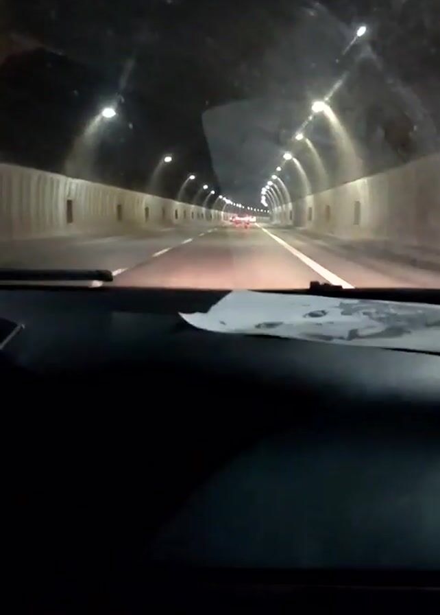 car driving through a tunnel. The tunnel has evenly spaced lights on the ceiling. There are other cars further ahead. A piece of paper is visible on the dashboard. The video is filmed from the driver's perspective.