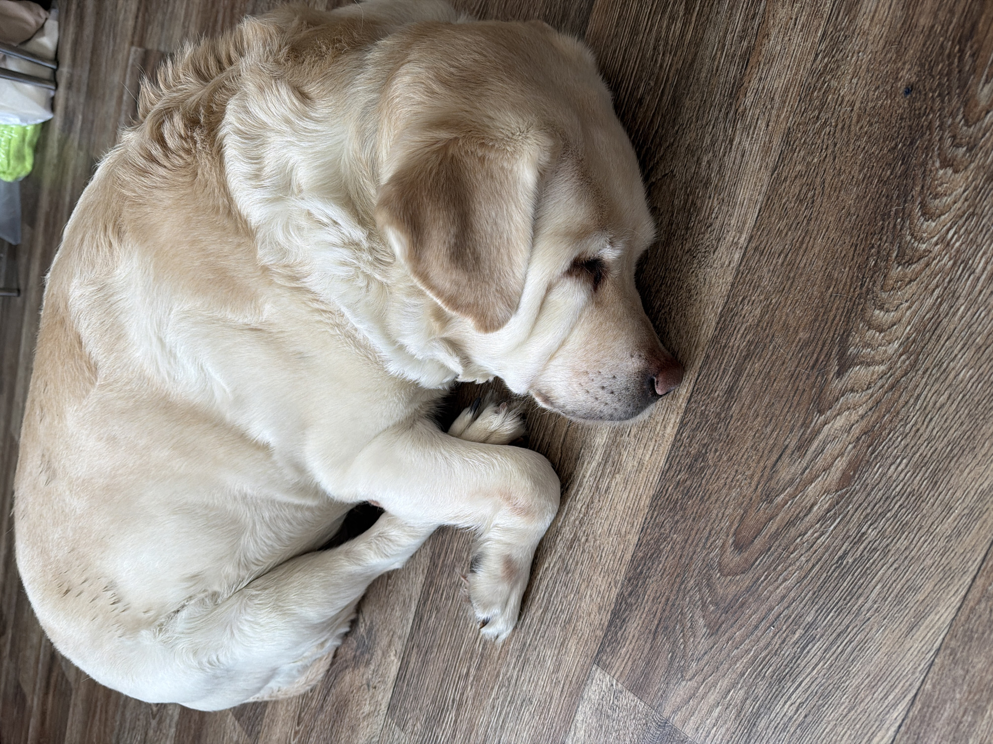A single, light-colored Labrador Retriever is lying curled up on a wood-patterned floor