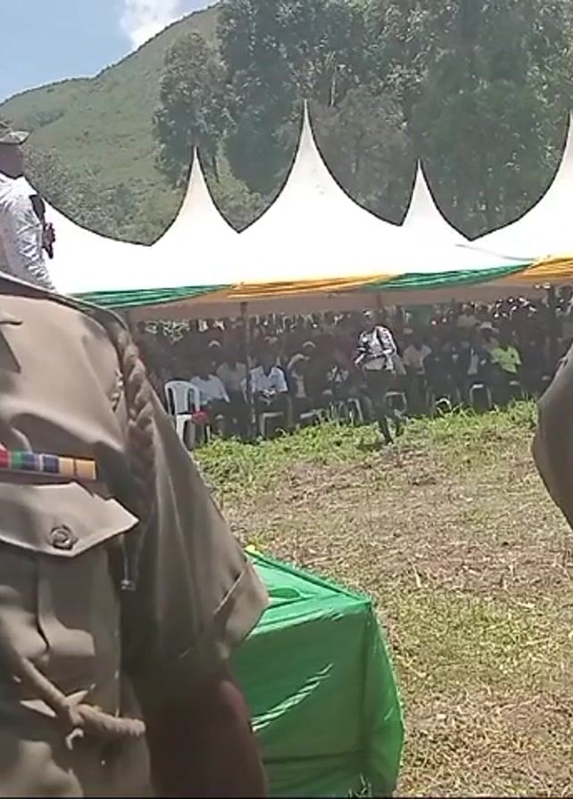 two men in khaki military-style uniforms, standing in a field. The man on the left is older, with a name tag visible. In the background, a crowd of people is gathered under white tents with yellow and green trim, possibly for an event. A man in white pants and a white patterned shirt stands on top of a green-draped platform, speaking into a microphone and holding a cane. A mountain covered in trees is visible in the distance.