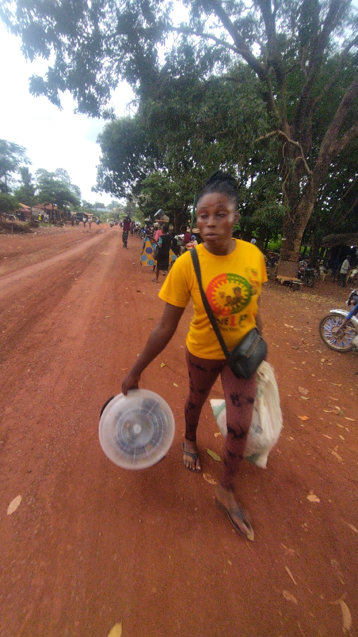 A young Black woman walks forward on a reddish-brown unpaved dirt road in Ito, Nigeria, under an overcast sky