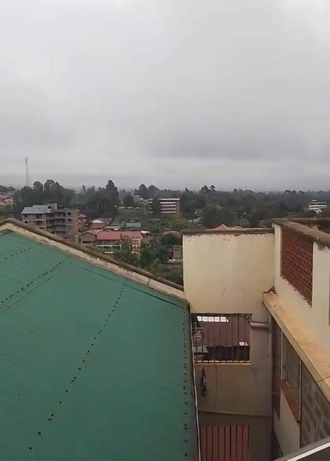 The video captures a view from a rooftop under a cloudy, overcast sky